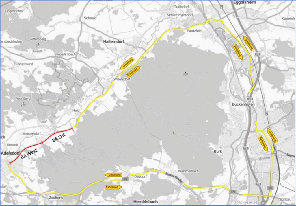 Das Staatliche Bauamt Nürnberg erneuert vom 29. September bis voraussichtlich Mitte November 2025 den über drei Kilometer lange Straßenabschnitt entlang der Staatsstraße 2264 von Adelsdorf über Weppersdorf bis zur Bauamtsgrenze bei Haid. Während der gesamten Bauzeit muss die Staatsstraße 2264 für den Gesamtverkehr vollgesperrt werden. Eine überörtliche Umleitung wird eingerichtet.