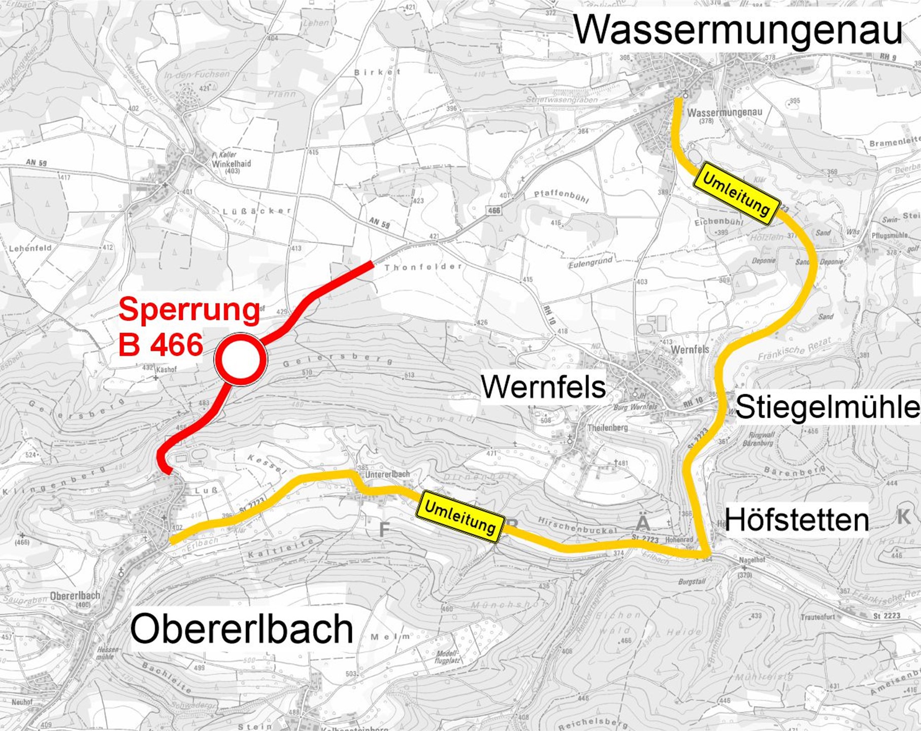 Der Verkehr wird in beide Fahrtrichtungen über die St 2223 bei Wassermungenau nach Höfstetten (Richtung Spalt), dann über die St 2723 in Richtung Obererlbach auf die B 466 umgeleitet. Für den Verkehr in Fahrtrichtung Schwabach in Obererlbach in die gegen Richtung.