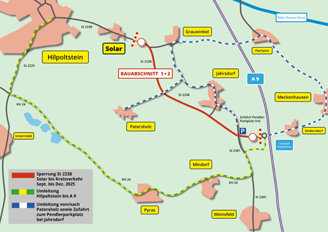 Am 27.10.2025 startet der zweite Abschnitt der Staatsstraßensanie-rung: Es wird das bestehende Baufeld der St 2238 zwischen dem Kreuzungsbereich St 2238/St 2391 nach Weinsfeld und Kreisverkehr an der Anschlussstelle Hilpoltstein der BAB 9 erweitert. Der Verkehr der Staatstraßen wird ab dem 27.10.2025 durch das Gewerbegebiet "An der Autobahn" umgeleitet.